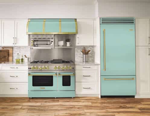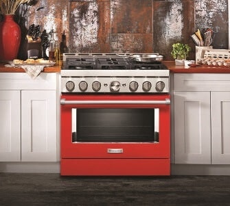 Consider a red range and accompanying hood set among white cabinets and a stunning marble or quartz countertop. The combination can be breathtaking. When thinking about colors, consider all hues, tints, tones, and shades as your selection can make a statement.